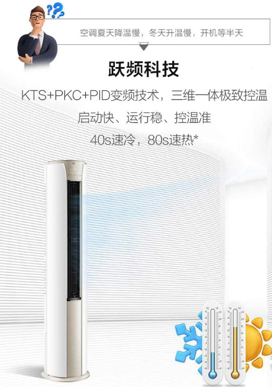 空調(diào)夏天降溫慢,冬天升溫慢,開機等半天,這款靜悅空調(diào)采用KST+PKC+PID變頻技術(shù),三維一體極致控溫,啟動快、運行穩(wěn)、控溫準(zhǔn),40S速冷,80S速熱。搭配強勁壓縮機,強勁動力,速冷速熱。還帶有56℃除菌自清潔功能,出風(fēng)口溫度達(dá)到56℃以上,并持續(xù)30分鐘,空調(diào)內(nèi)部形成一個高溫除菌區(qū),高效除菌,只吹干凈風(fēng)。次空調(diào)采用上下分段式豎百葉,可根據(jù)用戶需求獨立控制,采用專利導(dǎo)風(fēng)板應(yīng)用高爾夫球面導(dǎo)流科技,20個大波浪導(dǎo)板,1800個高爾夫球面,分散氣流,送風(fēng)更舒適。?